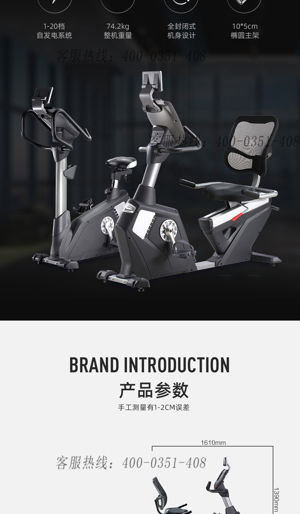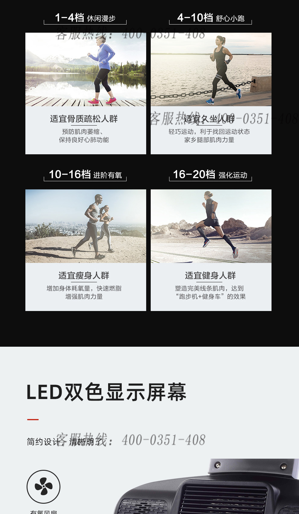 | 阻力系统:1-20档自发电 | 屏幕:LED显示屏 | 内置风扇:有 | 承重:150kg |